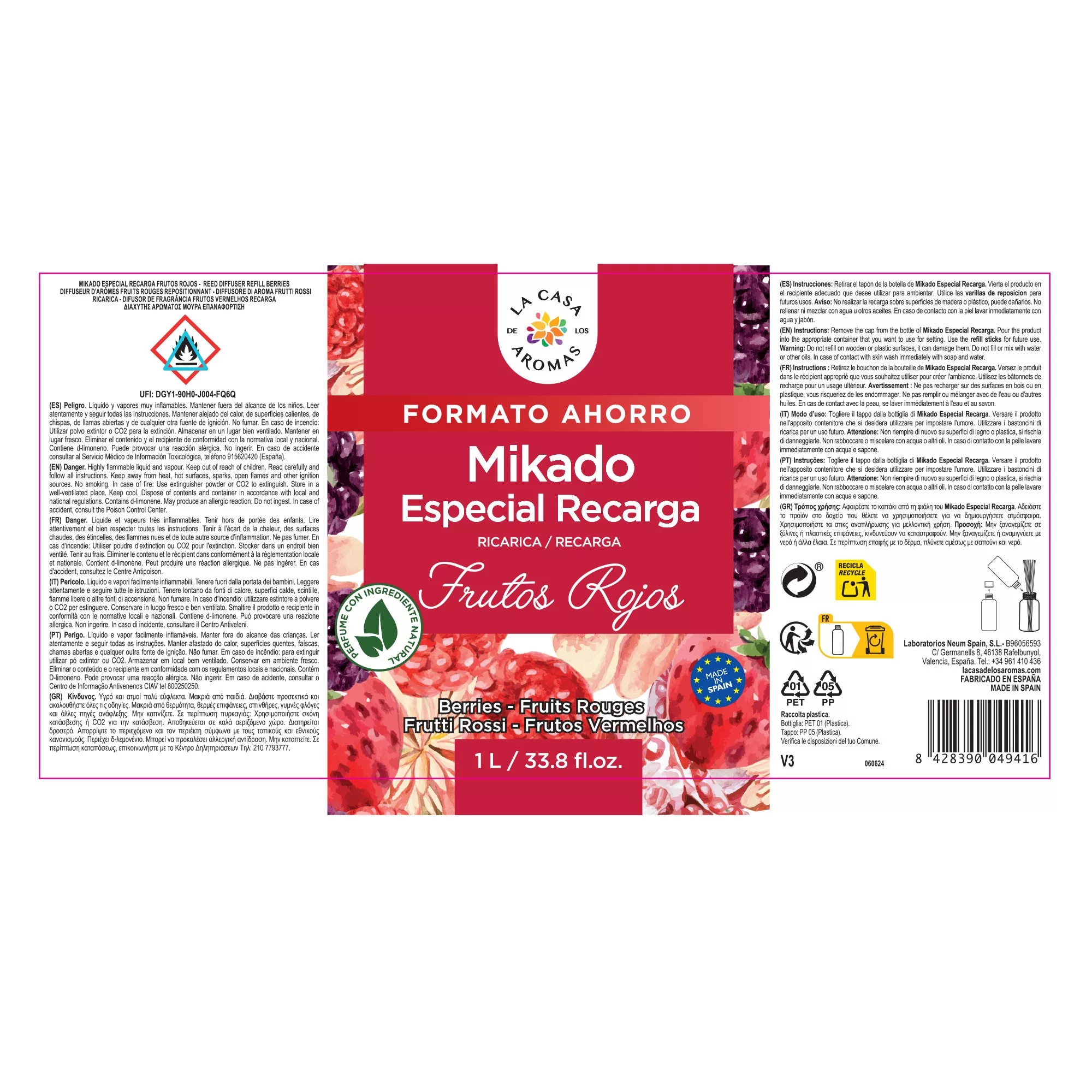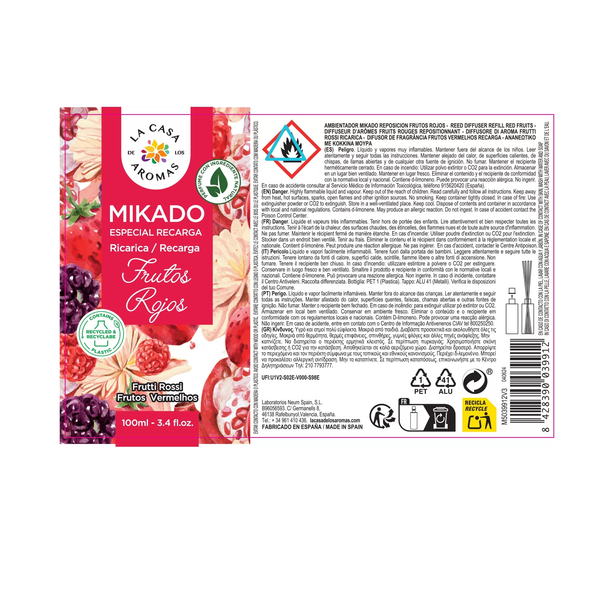 Tenemos a tu disposición los mikados de reposición para poder rellenar el mikado con la esencia escogida. El aroma de frutos rojos es muy dulce y afrutado. Produce una agradable sensación de alegría y vitalidad.