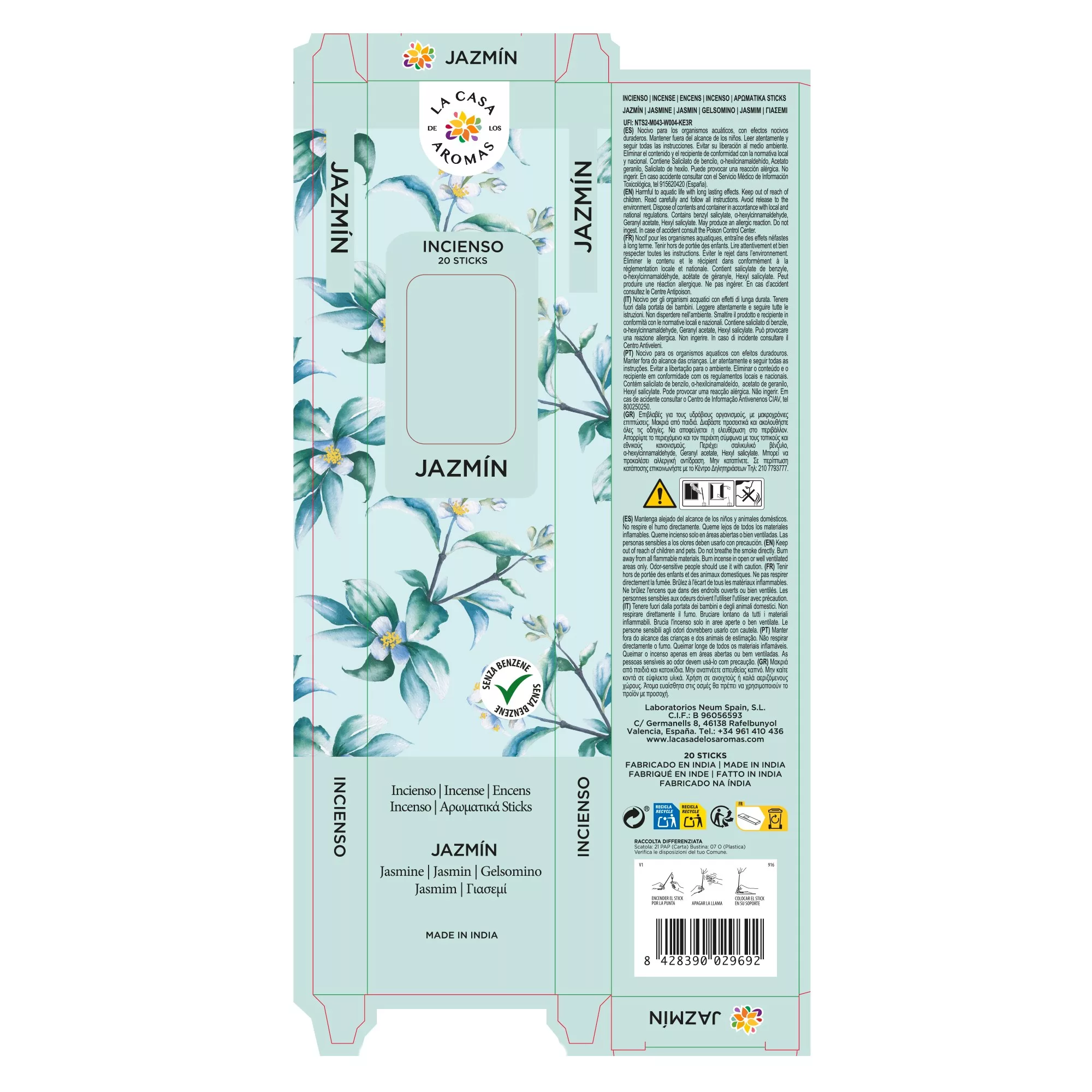 https://panel.lacasadelosaromas.com/producto/pack-6-sets-20-sticks-incienso-jazmin/1933Pack 6 sets 20 sticks Incienso JazmínEl incienso es una preparación resinosa, se le añaden aceites esenciales de origen vegetal que al ser quemadas desprenden un humo fragante para aromatizar espacios y crear ambientes, con fines terapéuticos o para la meditación. Para un buen uso del stick de incienso es necesario colocarlo en un porta inciensos. Genera entusiasmo y optimismo, y desarrolla la concentración e inspiración. Nuestros inciensos son naturales y no contienen benceno.https://panel.lacasadelosaromas.com/wp-content/uploads/2026/02/029692.png3.46instockInciensos60D63.676https://panel.lacasadelosaromas.com/wp-content/uploads/2026/02/029692.png99097983431005541943299005.763.462.3039.932020-01-31T09:02:41+01:00