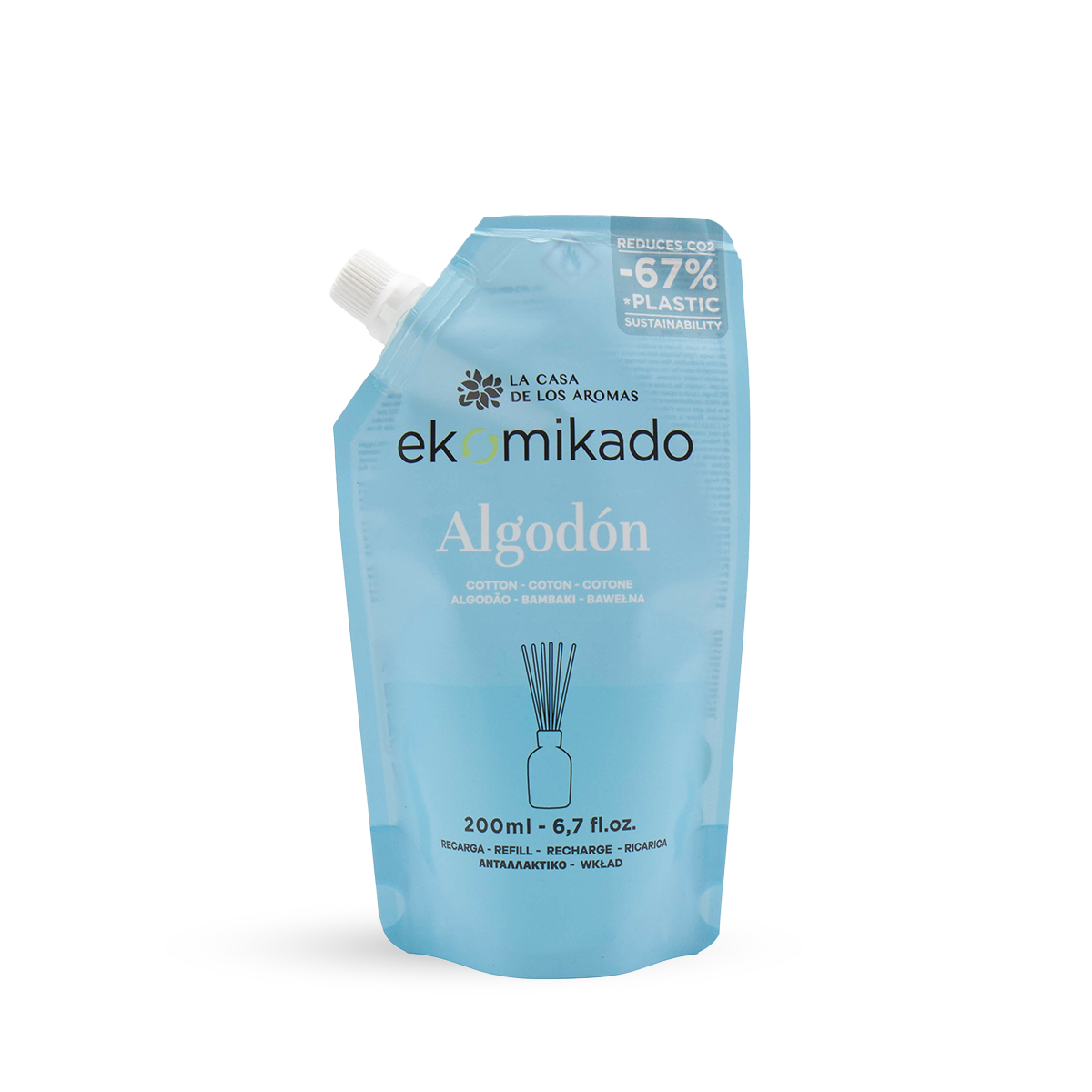 EKOMIKADO es una recarga de ambientador mikado en un formato innovador, una bolsa doypack que reduce el consumo de plástico y la huella de carbono frente a otras opciones tradicionales como los formatos de reposición en botella de plástico. Es una respuesta a tu compromiso, y el nuestro, con el consumo responsable.