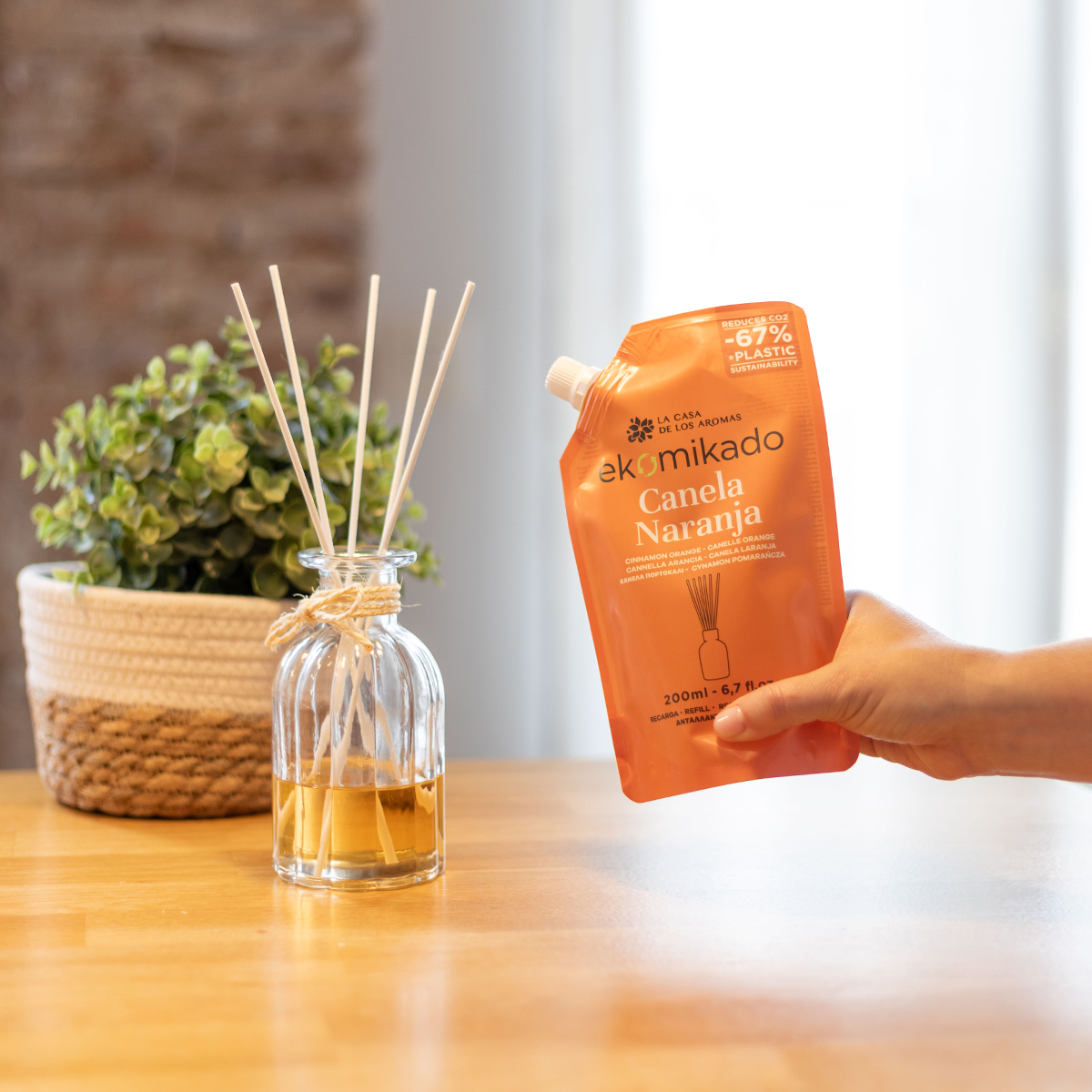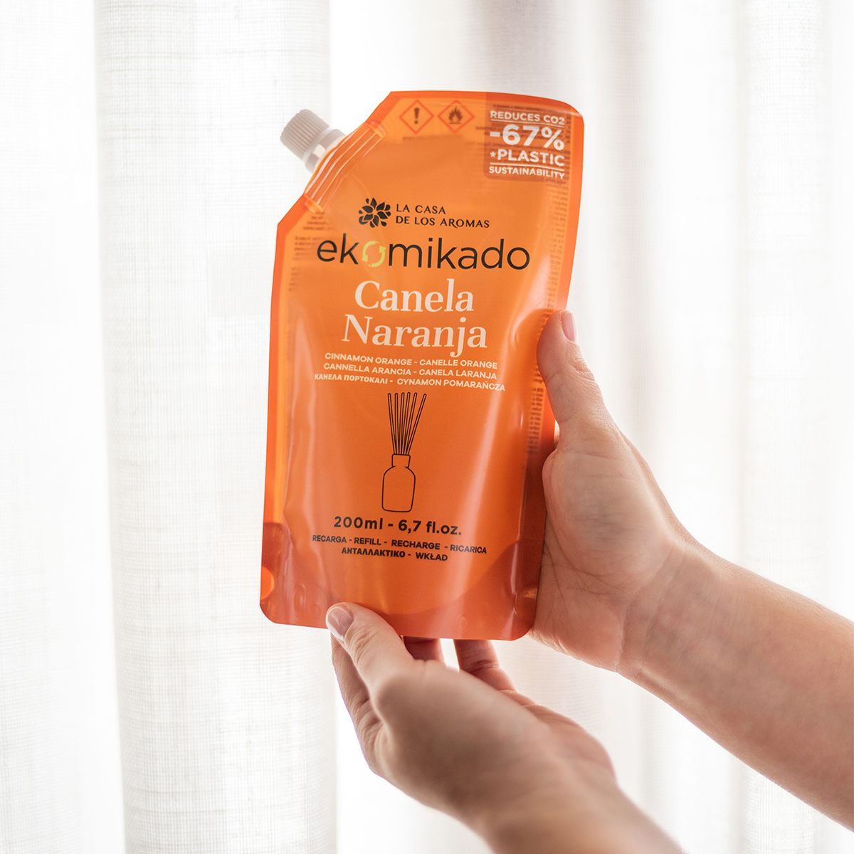 EKOMIKADO es una recarga de ambientador mikado en un formato innovador, una bolsa doypack que reduce el consumo de plástico y